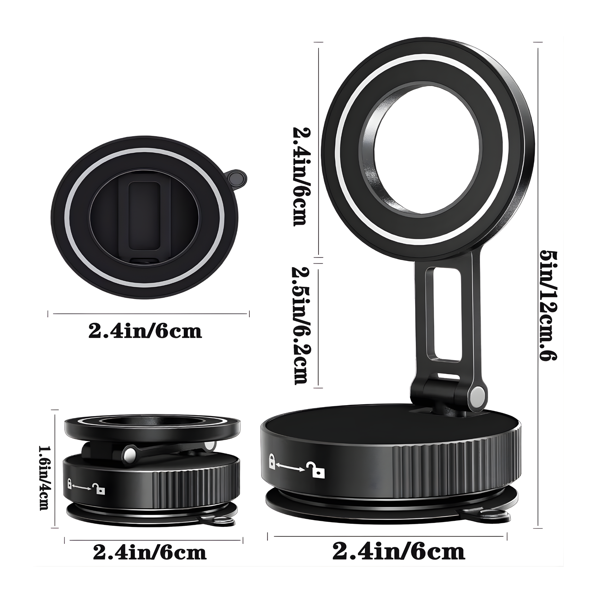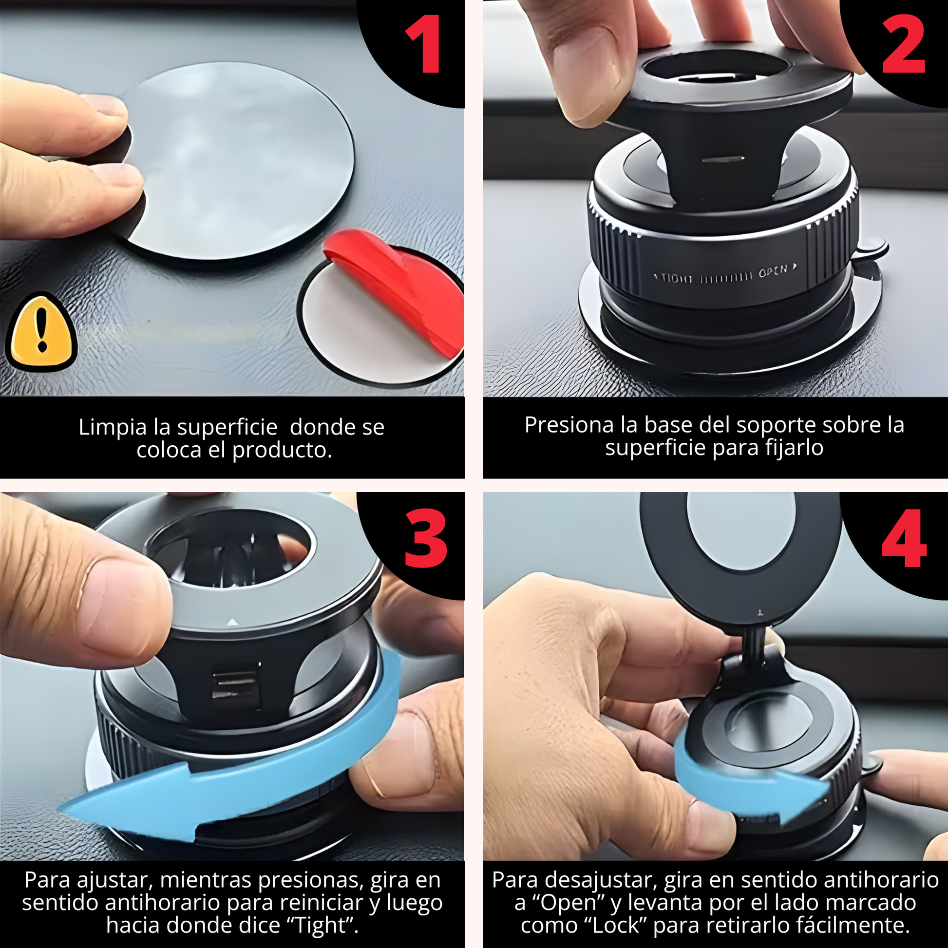 Coloca la base de succión sobre una superficie lisa como vidrio, espejos o el tablero del auto. Luego gira el anillo hasta que quede firmemente bloqueado.